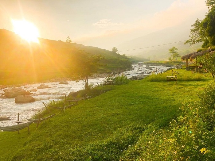 Một trong những điểm đến ở Sapa gắn liền với suối Mường Hoa rất đẹp và rất hot chính là khu nghỉ dưỡng Utopia Eco Lodge. Nơi đây là một thảo nguyên xanh mát với những trảng cỏ trải dài dọc theo bờ suối. Utopia Eco Lodge gồm những căn nhà gỗ xinh xinh, những bộ bàn ghế đơn sơ bố trí ngay cạnh suối để du khách có thể chill và ngắm hoàng hôn.