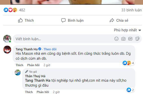 Ngay phía dưới bài đăng của nữ diễn viên Vợ quan, Tăng Thanh Hà cũng nhanh chóng trải lòng. Cô cho biết bản thân nhóc tỳ thứ 3 nhà mình cũng đang bị ốm và cô phải thức đêm trông con. "Hix Mason nhà em cũng đang bệnh sốt. Em cũng thức trắng luôn. Đang có dịch cúm A". Trước lời than thở của người bạn, bà mẹ đơn thân Thân Thúy Hà cũng vừa an ủi bạn lại vừa an ủi chính bản thân mình "Tội nghiệp tụi nhỏ ghê, con nít mùa này sốt, ho thương gì đâu".